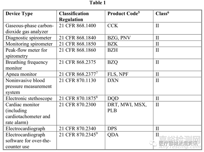本指南中描述的強制執(zhí)行政策適用于修改后的設備,其中原始設備是指南中列出的合法銷售的非侵入性遠程監(jiān)測設備,這些設備用于測量或檢測常見生理參數(shù),并用于支持患者監(jiān)測(見下表1)。