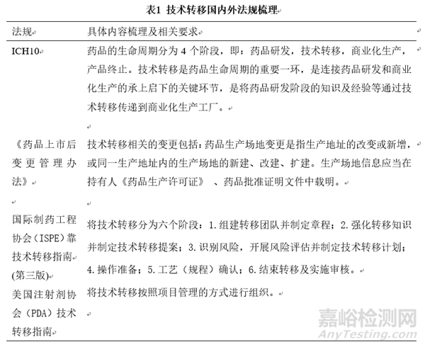 藥品技術(shù)轉(zhuǎn)移作為藥品生命周期中不可或缺的重要部分,直接關(guān)系到產(chǎn)品的安全性、有效性和質(zhì)量可控性。目前,國內(nèi)還未設(shè)立針對藥品技術(shù)轉(zhuǎn)移的法規(guī)或指導(dǎo)原則,相關(guān)文獻(xiàn)報道也較少。企業(yè)應(yīng)當(dāng)始終貫徹“質(zhì)量源于設(shè)計”的理念,建立基于風(fēng)險和科學(xué)的流程和方法設(shè)計,最終實現(xiàn)產(chǎn)品受控和數(shù)據(jù)完整性。結(jié)合我公司的具體情況,如各類仿制藥新品開發(fā)、一致性評價等環(huán)節(jié)均涉及技術(shù)轉(zhuǎn)移情況,本文針對藥品技術(shù)轉(zhuǎn)移的法規(guī)要求和具體實際過程進(jìn)行了梳理,為提升公司產(chǎn)品質(zhì)量管理提出建議。