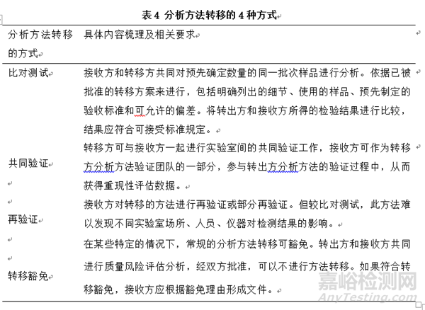 分析方法轉(zhuǎn)移的方式通常分為4種:比對測試、兩個或多個實驗室共同驗證、再驗證和轉(zhuǎn)移豁免[3]。