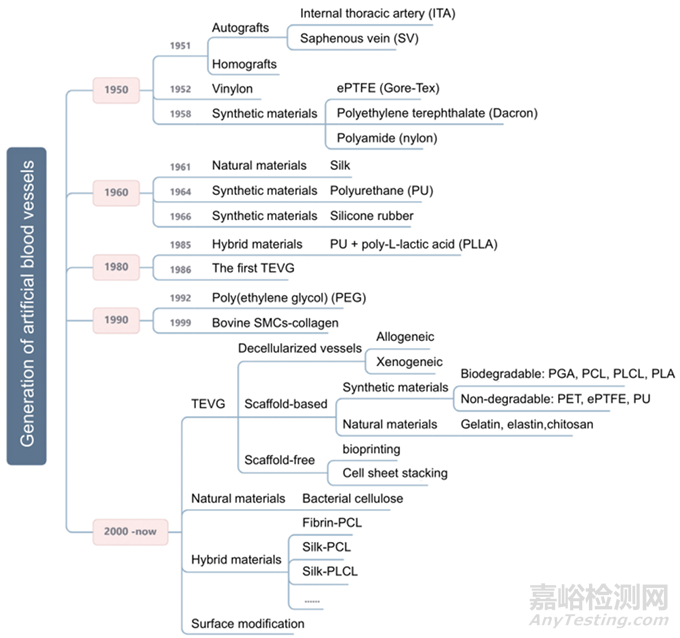 如下圖所示,研究人員始終在嘗試改善對人工血管移植物的需求。早在1900年左右,奧地利-德國外科醫(yī)生Payr用可吸收鎂制成的細管進行了實驗,標志著人工血管首次用于人類。然而,由于鎂誘導的纖維化組織的形成,患者在3天后死于肺炎。1951年3月,Dubost等利用尸源主動脈同種異體移植物進行了第一次成功的動脈瘤切除和移植物植入。1954年,Blakemore和Voorhees首次用合成動脈替代品治療了10名患者,為后來人造血管的快速發(fā)展奠定了基礎。然后,在1958年,De Bakey等人提出了Dacron人造血管作為尸源同種異體移植物的替代物,后者易于出現(xiàn)晚期并發(fā)癥。隨后,大多數(shù)研究人員將注意力集中在各種其他合成材料上,其中滌綸、聚氨酯和膨體聚四氟乙烯(ePTFE)已被證明是血管外科手術中最可行的,但這種材料不適合血管直徑<6 mm的情況。