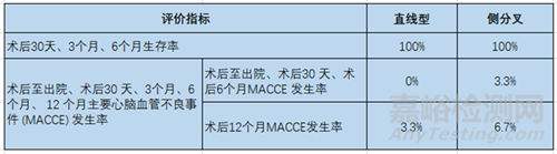 直線型和側分叉人工血管試驗中,術后12個月生存率分別為100%、96.7%。次要安全性評價指標見表3,次要有效性評價指標見表4。