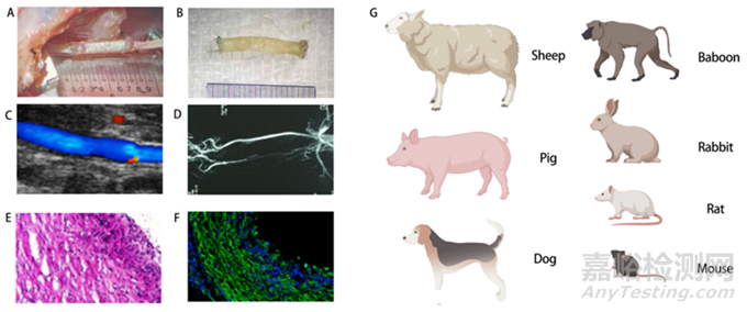 人工血管的體內評估。(A)植入時移植物的大體視圖。(B)移植術后大體視圖。(C)移植到大鼠頸總動脈的超聲圖像。(D)顯示移植物通暢性的血管造影記錄代表性圖像。(E)蘇木精和伊紅橫截面圖。(F)血管移植物中段的免疫熒光圖像。(G)用于體內評估的常見動物模型。