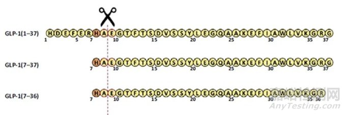 胰高血糖素樣肽-1(Glucagon-like Peptide 1,GLP-1),是由三十個(gè)氨基酸組成,由人胰高血糖素基因編碼,腸道L細(xì)胞分泌的一種肽類激素。當(dāng)GLP-1與胰島β細(xì)胞表面的GLP-1受體結(jié)合后,β細(xì)胞質(zhì)內(nèi)的鈣離子濃度升高,增強(qiáng)胞內(nèi)胰島素貯藏顆粒的胞吐作用,促進(jìn)胰島素釋放。GLP-1還可以刺激胰島β細(xì)胞的增殖和分化,抑制β細(xì)胞凋亡。然而,不是生物體內(nèi)所有形式的GLP-1都具有降糖作用,體內(nèi)有生物活性的GLP-1有兩種形式,即圖2中的GLP1 7-37和7-36。GLP-1會(huì)迅速被細(xì)胞表面的DPP-4蛋白酶水解,從而失去降糖活性,因而不具備穩(wěn)定性。因此,針對(duì)GLP-1受體的降糖藥物不僅需要與GLP-1具有相同或者類似的生物活性,且應(yīng)不易被DPP-4蛋白酶水解,即GLP-1受體激動(dòng)劑(GLP-1 receptor agonist, GLP-1RA)。