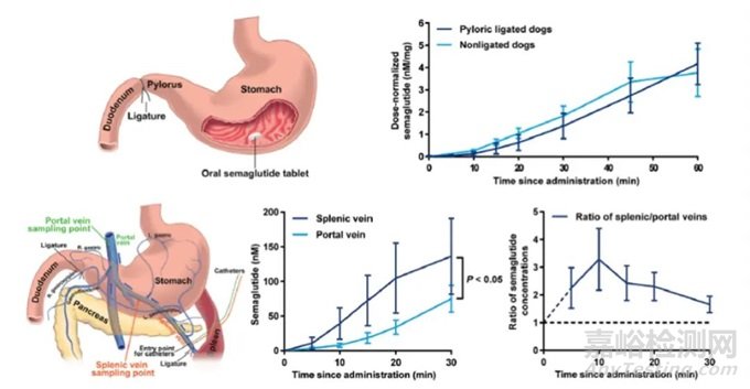 通過(guò)比較正常犬和幽門(mén)結(jié)扎犬口服索馬魯肽片劑后藥時(shí)曲線如圖6,幽門(mén)結(jié)扎后對(duì)索馬魯肽的吸收并沒(méi)有顯著的影響[9]。為了進(jìn)一步證實(shí)索馬魯肽在胃部吸收,研究人員將犬脾靜脈底端和右側(cè)胃網(wǎng)膜靜脈結(jié)扎,此時(shí)脾靜脈血全部來(lái)自于胃部,而門(mén)靜脈血主要來(lái)自于小腸??诜黢R魯肽后分別采集脾靜脈血和肝門(mén)靜脈血。結(jié)果所示,脾靜脈中索馬魯肽的濃度遠(yuǎn)高于肝門(mén)靜脈,說(shuō)明索馬魯肽最初的攝取是發(fā)生在胃部,而不是小腸。