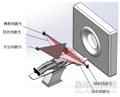 激光定位系統(tǒng)采用右手直角坐標(biāo)系,使用不高于2M類的二極管微激光器件,可投射出線寬不大于1mm的清晰、明亮的紅色、綠色或藍(lán)色激光線。安裝在X、Y、Z方位的激光燈組在接收到影像坐標(biāo)后,通過手動或者遙控調(diào)節(jié),可分別投射出矢狀面、冠狀面和橫斷面,并在患者體表兩側(cè)及上表面顯示出“十”字標(biāo)記點(diǎn),以便放射治療時(shí)對患者進(jìn)行定位。