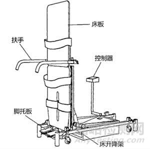 直立康復(fù)訓(xùn)練床通常由床板、機(jī)械支撐部件、電動(dòng)控制裝置、固定保護(hù)裝置、扶手、腳輪、腳托板等組成。具體產(chǎn)品結(jié)構(gòu)示意圖見圖1。
