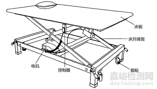 PT康復(fù)訓(xùn)練床通常由一段或兩段床板、機(jī)械支撐部件、電動(dòng)控制裝置、腳輪等組成。具體產(chǎn)品結(jié)構(gòu)示意圖見圖3。