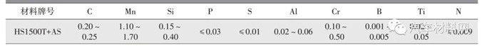 采用厚度為1.2 mm 的1 500 MPa 級別熱成形鋼板作為研究對象,鋼板的Al-Si 鍍層厚度為每面13 μm,鋼板的牌號及化學(xué)成分如表1 所示。