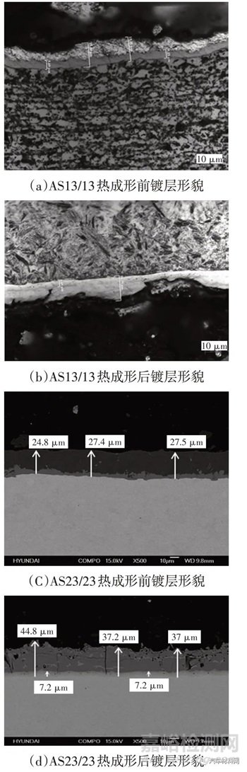 采用激光共聚焦顯微鏡對AS23/23 專利鍍層和AS13/13 薄鍍層熱成形鋼的熱成形前、后鍍層組織和厚度進(jìn)行觀察和測量,相關(guān)結(jié)果如圖3 所示。