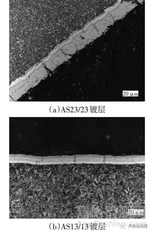 從觀察和測量結(jié)果,可以發(fā)現(xiàn):熱成形前Al-Si鍍層總厚度在13~15 μm 之間波動,Al-Si-Fe 三元合金抑制層厚度大約為5~6 μm。板料熱成形后,Al-Si 鍍層總厚度大約在15~26 μm 之間波動,典型厚度為20 μm。相對的,專利AS23/23 鍍層,熱成形前鍍層總厚度為23 μm 左右,熱成形后鍍層總厚度為40 μm左右。2種鍍層在厚度上存在明顯差異。