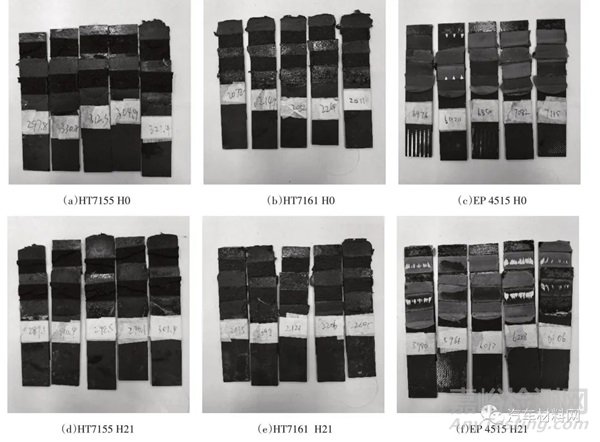 采用MACHINE DE TRACTION INSTRON 4469拉力試驗機(jī),依照D47 1165《涂在白車身或涂漆車身上的產(chǎn)品和塑料加速老化試驗標(biāo)準(zhǔn)》對搭配總成進(jìn)行加速老化,對老化前狀態(tài)H0 以及老化后狀態(tài)H21 進(jìn)行拉伸,已驗證其斷裂力和斷裂表面狀態(tài)。試驗板料拉伸后試驗樣件照片如圖7 所示。