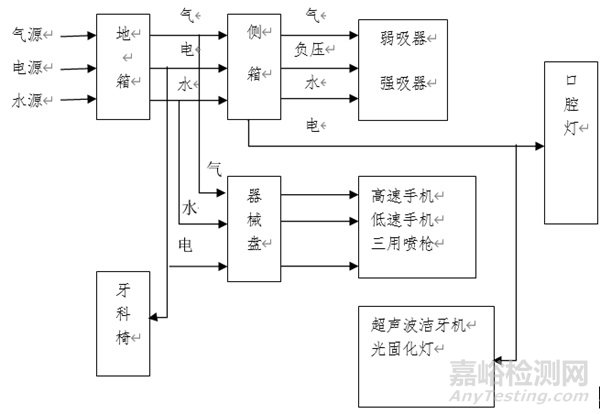 電壓220V、50Hz的交流電源進入地箱,經(jīng)電源變壓器(或開關(guān)電源)及接線排分配后,分別送到口腔燈、牙科椅、器械盤等用電部位。
