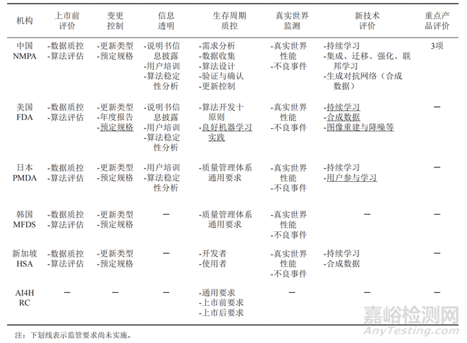 美國聯(lián)合加拿大、英國發(fā)布算法開發(fā)十原則提供生存周期質(zhì)控建議,后續(xù)擬制定良好機(jī)器學(xué)習(xí)實(shí)踐相關(guān)文件;中國明確生產(chǎn)周期質(zhì)控具體要求,涵蓋需求分析、數(shù)據(jù)收集、算法設(shè)計(jì)、驗(yàn)證與確認(rèn)、更新控制;新加坡從開發(fā)者、使用者角度提供生存周期質(zhì)控建議,包括設(shè)計(jì)、實(shí)現(xiàn)、測(cè)試、使用、監(jiān)測(cè)、評(píng)估;AI4H從通用要求、上市前要求、上市后要求3方面提供生存周期質(zhì)控建議。