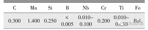 在1 500 MPa 級別熱成形鋼22MnB5 的成分基礎(chǔ)上,適當提高碳含量,同時添加微合金化元素Nb。根據(jù)材料基因工程的思路,在成分設計階段,Nb 質(zhì)量分數(shù)變化范圍為0.01%~0.1%,Ti 質(zhì)量分數(shù)變化范圍為0.01%~0.05%,設計的成分見表1。