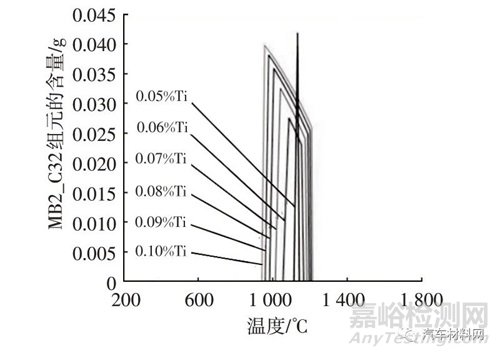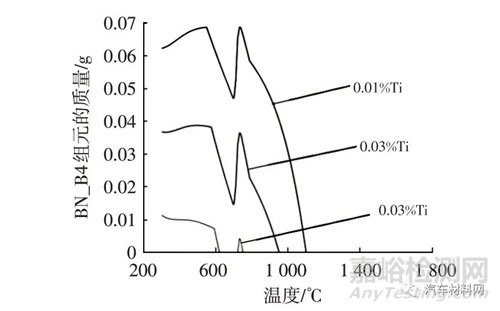 圖3 Ti含量對Ti與B的化合物析出的影響規(guī)律