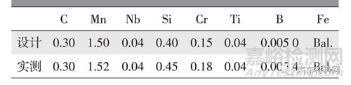 按照上述成分設計理念冶煉后得到的1 800 MPa熱成形鋼設計與實測成分如表2 所示。