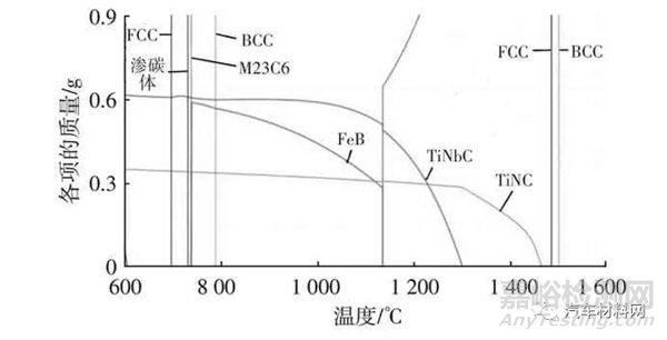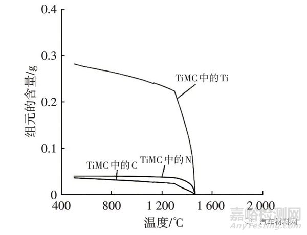 Ti 會在高溫階段和N 結(jié)合成氮化物,且阻止晶粒長大。Nb 的碳氮化物通常會在熱變形過程中組織奧氏體再結(jié)晶從而達到細化晶粒的目的[11-12]。為了提高熱成形鋼淬透性,加入了微量的B 元素,因為B 元素能夠極大提高淬透性。但是B 容易在高溫和N 形成BN,從而消耗掉B 元素,降低了奧氏體的淬透性。N 元素在鋼中是不可避免的,為了阻止BN 的析出,向鋼中加入與N 結(jié)合力更強的Ti,使Ti和N形成氮化物消耗掉N,使B固溶在鋼中。圖9為TiNC相中C、N、Ti元素的質(zhì)量分數(shù)隨析出溫度的變化,可以發(fā)現(xiàn)隨著溫度降低,N 元素質(zhì)量分數(shù)逐漸提高,鋼中N含量為40×10-6,即1 kg 鋼中含N 為0.04 g,由圖9可知,鋼中加入的Ti已經(jīng)把N完全消耗掉,避免了BN的形成。TiNC相中的主要元素為C、N和Ti,由圖9可知,Ti的質(zhì)量分數(shù)遠高于C和N,且隨著溫度降低,Ti的含量顯著增多,對比圖7可知,隨著溫度降低,TiNC 相逐漸增多,這是由于在溫度降低過程中Ti 的質(zhì)量分數(shù)逐漸增多導致的。圖10 為TiNbC 相中的元素含量隨溫度的變化規(guī)律,隨著溫度降低,Ti 元素含量先增加,后逐漸減少,而C 元素含量逐漸增加,增加速度逐漸降低,Nb 元素含量先迅速增加,在溫度約800 ℃以下后幾乎不再增加。TiNbC相中Nb元素含量最高,遠高于Ti和C。