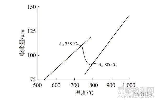 利用Thermo-Calc 軟件對表2 中的試驗鋼的相圖進行計算,如圖4 所示。利用DIL805A 熱膨脹儀對試驗鋼實際相變點進行測定,得到試驗鋼熱膨脹曲線如圖5 所示。得知試驗鋼Ac1溫度為738 ℃,Ac3溫度為800 ℃。