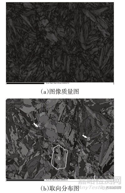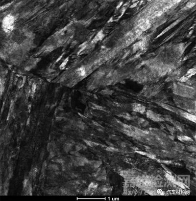 淬火后的組織電子背散射衍射(Electron Back Scattering Patterns,EBSD)如圖14 所示,圖14a 為圖像質(zhì)量圖,板條馬氏體的形貌清晰可見,圖14b 為取向分布圖,可以較明顯分辨出原奧氏體晶界和馬氏體塊(馬氏體板條束)的形貌,原奧氏體晶粒尺寸不超過15 μm,如圖中A 區(qū)域標注[14-15]。板條馬氏體的精細結(jié)構(gòu)分為原奧氏體晶界、束(Packet)、塊(Block)和板條(Lath)。板條馬氏體相變遵循K-S 關(guān)系(111)γ//(011)α’[101]γ//[111]α,在K-S關(guān)系中,奧氏體的面心立方{111}晶面族最多有4個晶面,即K-S 關(guān)系中面心立方慣習面,而每個(111)面上的<111>馬氏體的體心立方晶向族最多有6 個,所以最終馬氏體晶粒間的取向最多有24種。而一個Packet 就是在一個原奧氏體面心立方(111)面上切變產(chǎn)生的馬氏體Lath 的集合,而一個Block 就是具有在一個體心立方晶向的馬氏體Lath的集合。從取向分布圖可見部分馬氏體Block 貫穿整個奧氏體晶粒,Block的寬度最大約為5 μm,如圖14b 中B 箭頭標注。大部分Block 寬度小于5 μm,如圖15 中的透射電子顯微鏡(Transmission Electron Microscope,TEM)圖。另外,還存在很多更加細小的馬氏體Block,這可能是因為金相照片只能觀察一個平面,而馬氏體Block的取向在三維空間分布在三維空間各個方向,如果Block的方向和金相觀察面垂直或者近似垂直的話,那么金相圖片上觀察到的就是細小的顆粒狀,如圖14b 中箭頭C 標注[16-17]。