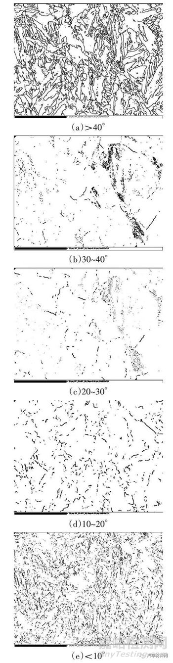 圖16 為EBSD 的晶界分布圖,其中圖16a 為所有大于40°的晶界,圖16b 為30~40°的晶界,可見只有少量晶界的取向差處于30~40°。圖16c 為20~30°的晶界,可見20~30°的晶界數(shù)量同樣較少。圖16d 為10~20°的晶界,可見10~20°晶界的數(shù)量較20~40°晶界數(shù)量有所增多。圖16e 為2~10°晶界,可見2~10°晶界分布于大于10°晶界之間,沒有形成完整的晶粒。如前所述,滿足K-S 關(guān)系的馬氏體晶粒取向可能有24 種,經(jīng)計算,這24種取向之間可能存在10 個取向偏差角,分別為10.53°、14.88°、20.61°、21.06°、47.11°、49.47°、50.51°、51.73°、57.21°和60.00°,即Block 之間的取向差。結(jié)合圖16 可見,10°以上取向差的Block 構(gòu)成了熱成形鋼馬氏體的形貌,其中Block 之間的取向差大部分大于40°。根據(jù)圖14~圖16 可知,細小的奧氏體晶粒和馬氏體Block 是此1 800 MPa 熱成形鋼具有高強度高塑性的主要原因[17-18]。