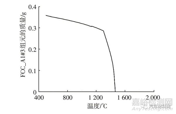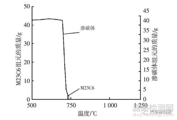 從圖4 中還可見,材料冷卻至300 ℃的過程中,鋼中分別出現(xiàn)了TiNC 相、NbTiC 相、M23C6相、滲碳體相、奧氏體和鐵素體相等主要相。其中TiNC相的析出溫度約為1 460 ℃,如圖6 所示。Nb 的碳化物以NbTiC 的形式析出,析出溫度約為1 300 ℃,如圖7 所示。Nb 的碳化物在高溫析出,可以有效阻止加熱過程中奧氏體的晶粒長大,從而達到細化晶粒的目的。NbTiC 相和TiNC 相隨著溫度的降低析出量逐漸增多。滲碳體的析出溫度約為728 ℃,且開始析出后隨著溫度的降低,析出量迅速增加,如圖8 所示。圖8 中還可以看到M23C6相的析出溫度約為890 ℃,溫度降低至728 ℃時消失。相比滲碳體相,M23C6相的析出量很少,可見M23C6相是過渡相,溫度降低至728 ℃以下后轉(zhuǎn)變?yōu)榱藵B碳體相。