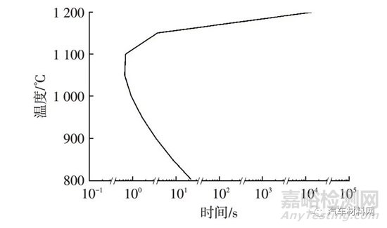 Nb 加入熱成形鋼中的作用是通過Nb 的碳化物在熱軋過程中析出,推遲奧氏體的再結(jié)晶,細化晶粒,從而提高熱成形鋼的韌性。碳化物的析出屬于擴散型相變,其形核和長大的行為受熱力學和動力學因素雙重作用影響的,因此在不同的溫度下,Nb 的碳化物要經(jīng)過不同的孕育期才能析出。利用Thermo-Calc 軟件中的Prisma 模塊計算了碳化鈮鈦(NbTiC)相的析出-溫度-時間曲線(Precipitating-Temperature-Time,PTT)如圖11 所示,可見NbTiC 相在不同溫度下的開始析出時間呈現(xiàn)“C”曲線特征,“C”曲線的“鼻尖”溫度為1 050~1 100 ℃,因此可以推斷,Nb 的碳化物在熱軋過程中析出,且在1 050~1 100 ℃溫度區(qū)間析出最快。Nb 微合金化1 800 MPa 熱成形鋼的熱動力學計算結(jié)果是制定熱加工工藝和熱處理工藝的重要依據(jù)。