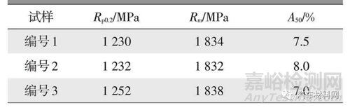 淬火后的力學性能如表3 所示,取3 個平行式樣以減小試驗誤差。3 個試樣淬火后的抗拉強度均超過1 800 MPa,且伸長率均超過6%,具有良好的強塑性。