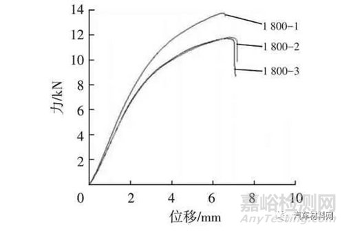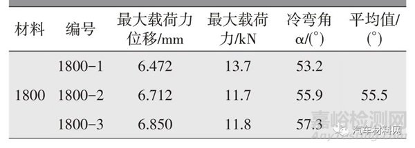 三點彎曲的冷彎力-位移曲線如圖13 所示,冷彎角計算結(jié)果見表4。相同的試驗條件下做了3 個平行試樣以減小試驗誤差。結(jié)果表明,最小的冷彎角為53.2°,平均值為55.5°,具有良好的韌性[13]。