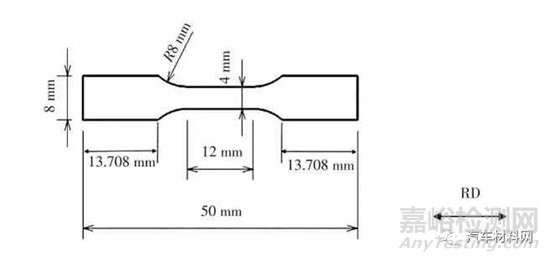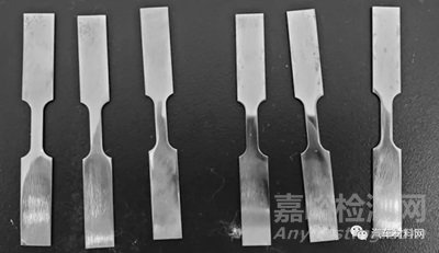 熱成形鋼在生產(chǎn)制造過程中的如鑄造、焊接、酸洗、涂鍍等環(huán)節(jié)均有可能導致氫原子進入基體,從而產(chǎn)生氫脆問題,即延遲斷裂[19]。延遲斷裂敏感性的評價方法有很多種,本次試驗采用電化學充氫后慢應變速率拉伸(Slow Strain Rate Testing,SSRT)和升溫熱脫附分析(Thermal Desorption Spectrum,TDS)檢測氫含量的方法進行延遲斷裂敏感性檢測,試驗方案如下:分別準備不充氫氣慢拉伸試樣和充氫慢拉伸試樣,試樣尺寸如圖17 所示。加工完成的試樣經(jīng)1200#的砂紙打磨拋光,確保表面和邊緣沒有可能影響試驗結(jié)果的劃痕和毛刺。對于不充氫試樣,使用10 mm 引伸計測量應變。拉伸選擇位移控制,位移速度選擇0.000 36 mm/s,記錄拉伸過程中的力和位移數(shù)據(jù)。對于充氫試樣,在拉伸前要進行充氫處理,每個充氫條件下采用2根試樣,一個充氫后進行慢拉伸,另一個測定其氫含量。充氫使用電化學工作站,采用電流模式,電流為-0.000 1 A(-0.1 mA),充氫時間為1~3 h。電解液為97 mL 的去離子水+3 g NaCl+0.3 g 硫氰酸銨(NH4SCN),充分攪拌使其全部溶解。測定氫含量使用的設備為Bruker TDS G4 Phoenix,使用的測定參數(shù)是升溫起始溫度30~650 ℃,升溫速度0.3 ℃/s。制作好的慢拉伸試樣如圖18。