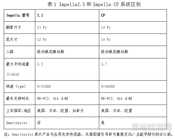 是一種左心室-主動(dòng)脈軸流式輔助裝置。其工作原理是運(yùn)用軸流泵通過置入左心室的導(dǎo)管將血液從左心室端流入口抽吸出,再通過主動(dòng)脈端流出口回輸至主動(dòng)脈,達(dá)到減輕心臟負(fù)荷的作用。該器械可以增加心輸出量,降低左心室壓力和容量,減少心室做功,降低心肌氧耗,也可以改善冠狀動(dòng)脈血流。目前獲得FDA批準(zhǔn)可用于HR-PCI輔助支持的為Impella系統(tǒng),包括Impella2.5 和Impella CP兩個(gè)型號(hào),具體區(qū)別見表1。