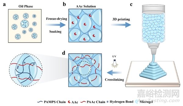 該研究的主要創(chuàng)新思想是:以聚電解質(zhì)微凝膠為基本單元和能量耗散中心,與第二網(wǎng)絡(luò)形成互穿雙網(wǎng)絡(luò)結(jié)構(gòu),合成高強(qiáng)韌水凝膠。利用微凝膠-單體分散液可逆的凝膠-溶膠轉(zhuǎn)變特性,實現(xiàn)了室溫下直接擠出打印,然后紫外光固化,制備得到高強(qiáng)韌、穩(wěn)定的微結(jié)構(gòu),從而解決了傳統(tǒng)3D打印水凝膠流動性、可打印性與結(jié)構(gòu)穩(wěn)定性之間的矛盾,為3D打印高精度且穩(wěn)定的微結(jié)構(gòu)提供了新思路。