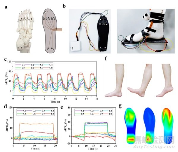 微凝膠增強(qiáng)雙網(wǎng)絡(luò)水凝膠具有較好的傳感靈敏度和出色的傳感穩(wěn)定性?;谶@一優(yōu)勢,該課題組設(shè)計制造了用于監(jiān)測足底生物力學(xué)特性的陣列式傳感器。根據(jù)人體足骨骼分布,設(shè)計了一個具有八通道水凝膠傳感器陣列的可穿戴鞋墊,監(jiān)測步態(tài)過程中足底應(yīng)力分布(圖3),在健康監(jiān)測和智能醫(yī)療設(shè)備中有著良好的應(yīng)用前景。