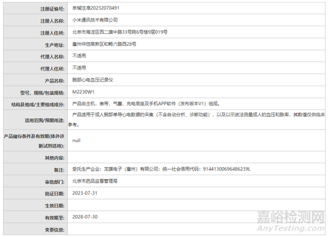 從北京市藥品監(jiān)督管理局官網(wǎng)查詢得知,小米腕部心電血壓記錄儀由主機(jī)、表帶、氣囊、充電底座及手機(jī)APP軟件(發(fā)布版本V1)組成。產(chǎn)品適用于成人腕部單導(dǎo)心電數(shù)據(jù)的采集(不含自動(dòng)分析、診斷功能),以及以示波法測(cè)量成人的血壓和脈率,其數(shù)值僅供臨床參考。該產(chǎn)品由龍旗電子(惠州)有限公司受托生產(chǎn)。