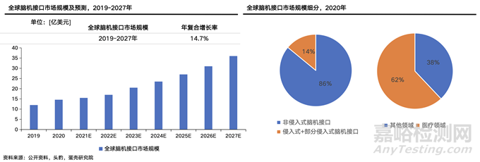 2020年全球腦機接口的市場規(guī)模達到14.6億美元,預計到2027年市場規(guī)模達36億美元,年復合增長率約為14%,行業(yè)市場規(guī)模大,增速快,腦機接口行業(yè)未來具有很大發(fā)展空間。