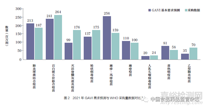 對比WHO 實際采購的疫苗產(chǎn)品與GAVI 基本需求預(yù)測表中的疫苗類型,需求預(yù)測表的12 種疫苗產(chǎn)品中共有9 種位于采購量的前20 名。以2021 年為例,百白破( 全細胞)- 乙型肝炎-b 型流感嗜血桿菌疫苗(百白破五價聯(lián)合疫苗)、肺炎球菌結(jié)合疫苗、麻疹疫苗和人乳頭瘤病毒疫苗這4 類疫苗的需求量和采購數(shù)據(jù)基本一致。輪狀病毒疫苗、滅活脊髓灰質(zhì)炎疫苗和乙型腦炎疫苗實際采購量比預(yù)測量增加, 相反麻疹- 風(fēng)疹疫苗和黃熱病疫苗的采購量未達到預(yù)期,如圖2所示。