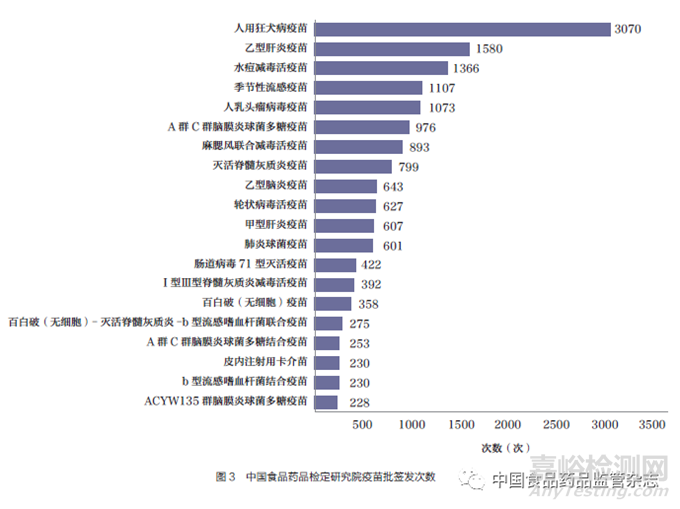 根據(jù)中國食品藥品檢定研究院在網(wǎng)站上公示的批簽發(fā)疫苗數(shù)據(jù)(數(shù)據(jù)查詢截至2023 年5 月15日),2020 年1 月6 日~2023 年5 月7 日公布的批簽發(fā)次數(shù)中前5項分別為人用狂犬病疫苗、乙型肝炎疫苗、水痘減毒活疫苗、季節(jié)性流感疫苗和人乳頭瘤病毒疫苗[19],如圖3 所示。