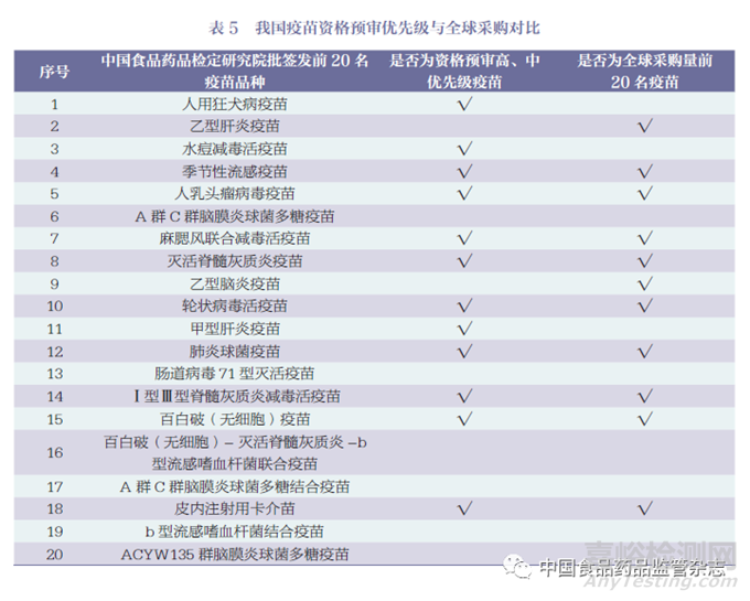 將中國食品藥品檢定研究院批簽發(fā)前20 名疫苗與全球采購數(shù)據(jù)及WHO 資格預(yù)審高、中優(yōu)先級疫苗進行比對,結(jié)果表明季節(jié)性流感疫苗、麻腮風(fēng)聯(lián)合減毒活疫苗、人乳頭瘤病毒疫苗、滅活脊髓灰質(zhì)炎疫苗、輪狀病毒活疫苗、肺炎球菌疫苗、百白破(無細胞)疫苗、Ⅰ型Ⅲ型脊髓灰質(zhì)炎減毒活疫苗和皮內(nèi)注射用卡介苗等均屬于高、中優(yōu)先級疫苗,且均位列全球采購量前20 名,說明我國市場成熟疫苗在國際市場也具有巨大發(fā)展空間,值得我國疫苗生產(chǎn)企業(yè)的關(guān)注,詳見表5。