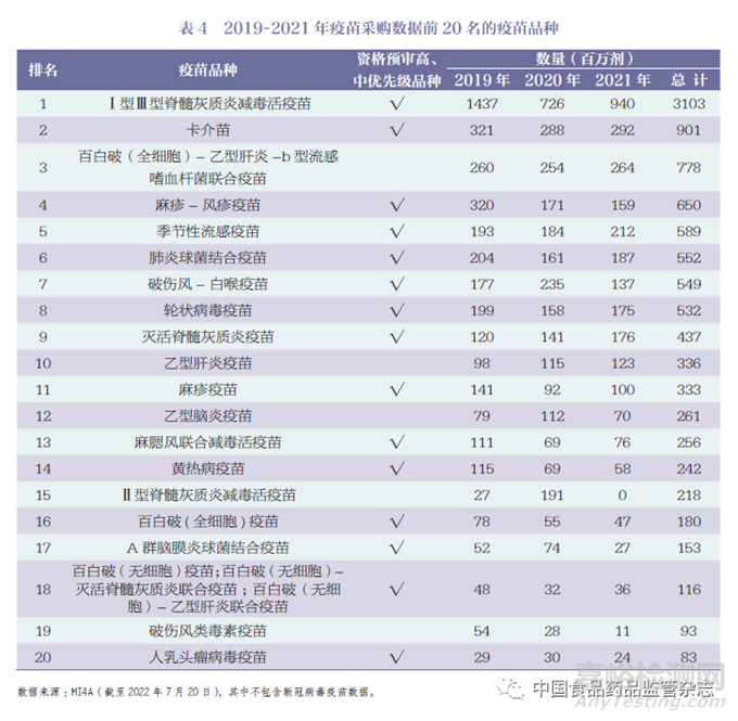 WHO MI4A(Market Information for Access) 發(fā)布的疫苗采購數(shù)據(jù)包含150 多個國家和地區(qū)通過WHO、UNICEF報告的疫苗采購信息,數(shù)據(jù)顯示2019~2021 年疫苗采購前20 名疫苗產(chǎn)品,詳見表4[15]。