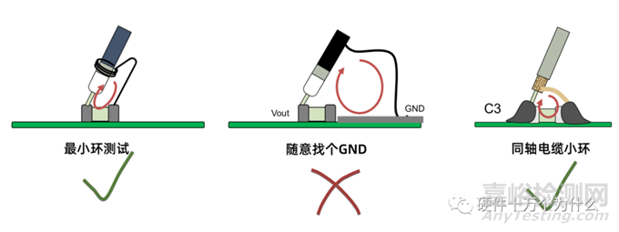 確保測量的回路區(qū)域足夠小。一般情況下,選擇離輸出電容越近的測量點,而且連接阻抗越低越好。測量點離電容器越近,在測量過程中產生的噪聲越小。