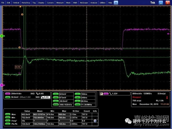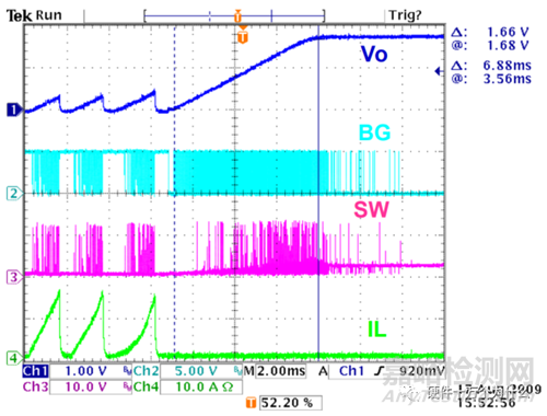 測試結果的讀取:調節(jié)好Slew Rate后,按測試工作表中的測試項, Enable Load 后,測試電壓輸出是否過沖。將測試結果(過沖電壓Vovershoot、過沖時間tos)填到表格中。