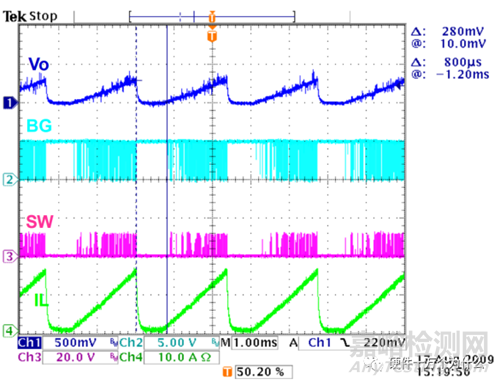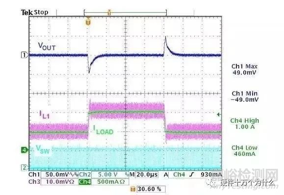 測量輸出的紋波時,應將探頭放置于輸出電容處,避免噪聲的耦合。在沒有負載跳變時,可以限制帶寬,得到比較干凈的紋波波形。