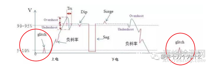 電壓進入上升通道之前以及電壓下降到10%之后,是否有Glitch(脈沖尖刺)