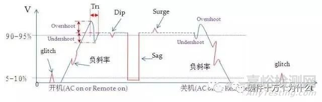 測試目的驗證待測電源在開/關機時,輸出電壓及信號是否符合規(guī)格要求(考察反饋設計是否欠阻尼或過阻尼):是否有電壓過沖, 是否有電壓回落, 是否有震蕩、震鈴。