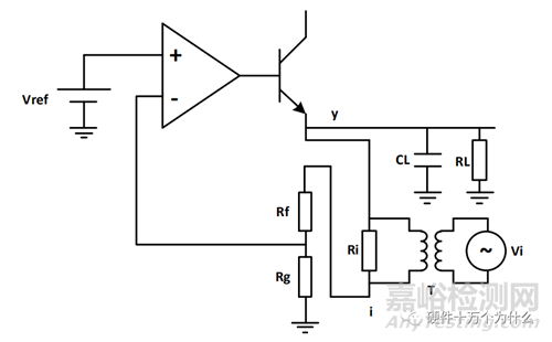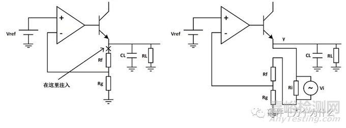 注入信號從注入電阻的一端注入到環(huán)路中,經過反饋網絡、誤差放大器和功率晶體管到達輸出,也就是注入電阻的另一端。這樣輸出信號 Vo 和注入信號 i 的數學關系就是我們要求的環(huán)路增益。