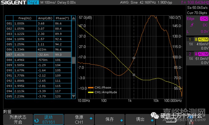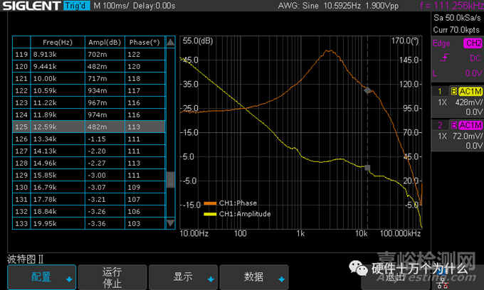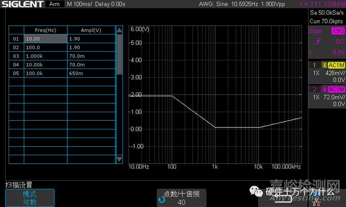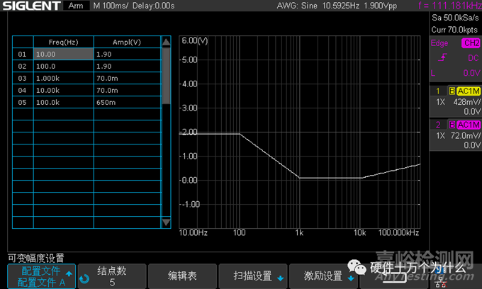 這一小節(jié)主要介紹了完成本次測量所需的關鍵設置,關于 Bode Plot 完整的使用說明,在進入 Bode Plot 軟件之前,建議先把要用到的通道設置為 20 MHz 帶寬限制。本次測量的頻率范圍是 10 Hz 到 100 kHz,這于一個預期的穿越頻率在 10 kHz 左右的電路來說足夠了。在 Bode Plot 的主菜單按配置信息進入配置菜單,編輯配置信息。進行通道設置,將 DUT 輸 入和 DUT 輸出設置到相應的通道上,設置好 DUT 輸入為 C1,DUT 輸出為 C2。測試與 SAG1021I 的連接是否成功。將掃描類型設置為可變幅度,設置掃描參數。將頻率模式設置為對數,在配置文件編輯里面建立 5 個結點,分別是 10Hz,100Hz,1KHz,10KHz,100KHz,對應的幅度分別為 1.9V,1.9V,80mV,80mV,1V,如下圖所示,將點數/十倍頻設置為 40。