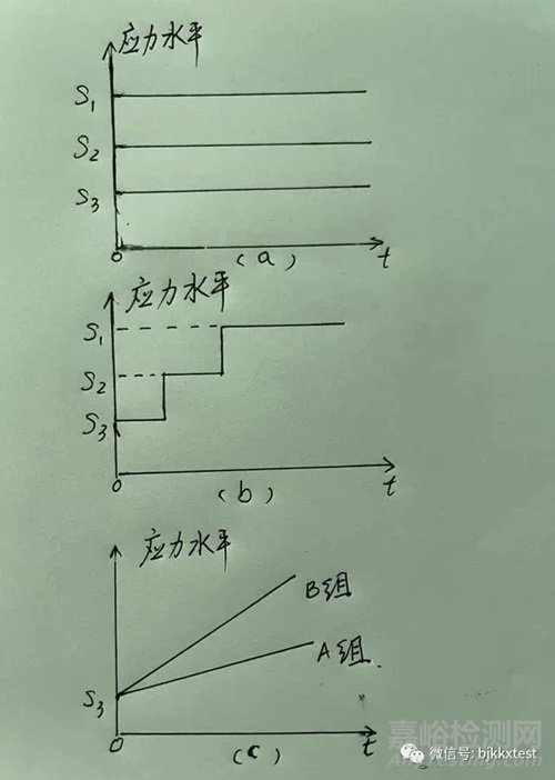 此試驗對產(chǎn)品所施加的“負荷”是在不同的時間段施加不同水平的“負荷”,其水平是階梯上升的。在每一時間段上的“負荷”水平,都高于正常條件下的“負荷”水平。因此,在每一時間段上都會有某些產(chǎn)品失效,未失效的產(chǎn)品則繼續(xù)承受下一個時間段上更高一級水平下的試驗,如此繼續(xù)下去,直到在最高應力水平下也檢測到足夠失效數(shù)(或者達到一定的試驗時間)時為止。步進應力試驗的應力加載時間歷程見圖 1(b)。