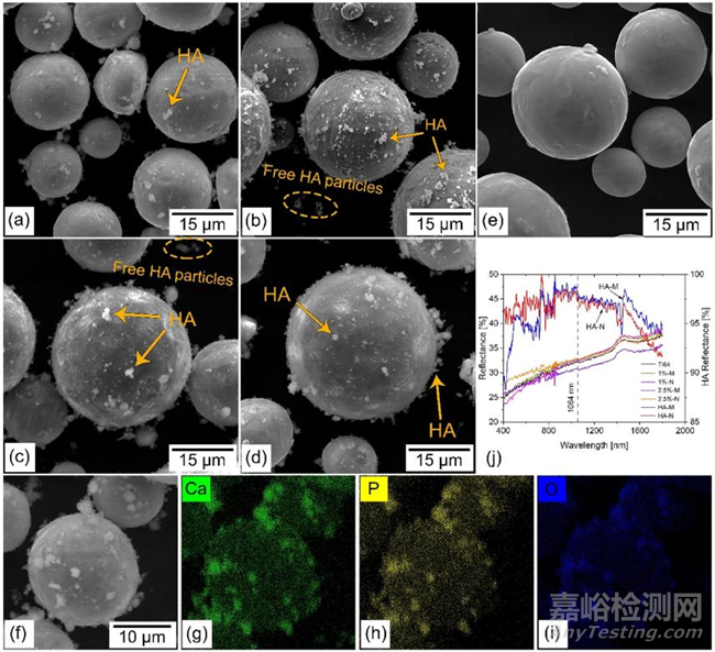 圖1 SEM 顯微照片:(a)1%-M、(b)1%-N、(c)2.5%-M、(d)2.5%-N復(fù)合材料、(e)Ti64粉末。(g,h,i)為(f)中所示的2.5%-M復(fù)合粉末的元素EDS 圖(j)Ti64、HA-M、HA-N和不同復(fù)合粉末的光反射率隨波長的變化。