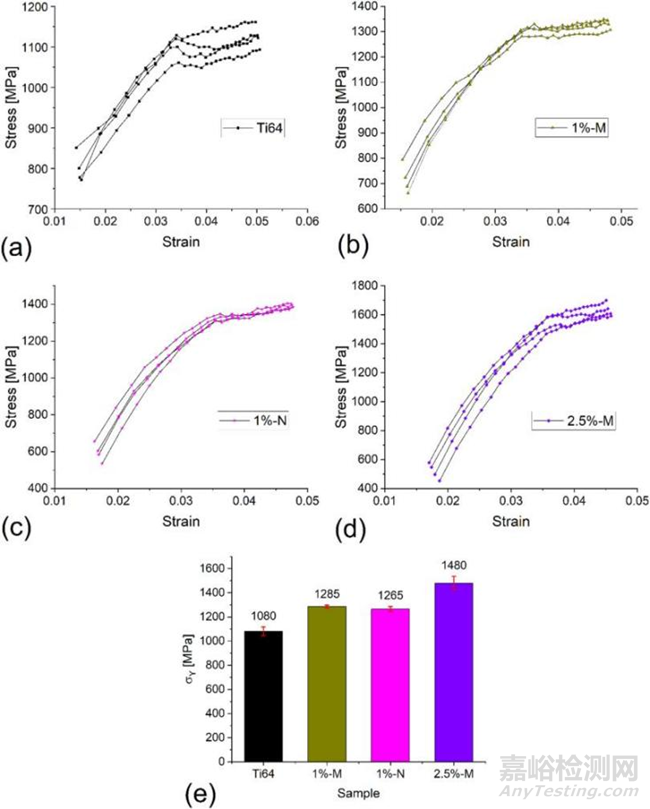 圖3 LPBF制造的納米壓痕應(yīng)力-應(yīng)變曲線:(a)整體Ti64,(b) 1%-M,(c) 1%-N,和(d) 2.5%-M 樣品。(e)從(a–d)中的納米壓痕衍生應(yīng)力-應(yīng)變曲線獲得的樣品的平均屈服強(qiáng)度。