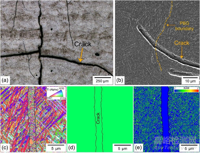 圖4 (a)OM和(b)來自LPBF制造的2.5%-M樣品橫截面的SEM圖像。(c)反極圖(IPF-X)、(d) 重建的PBG和(e)核平均取向誤差(KAM)EBSD圖,來自裂紋及其鄰近區(qū)域。