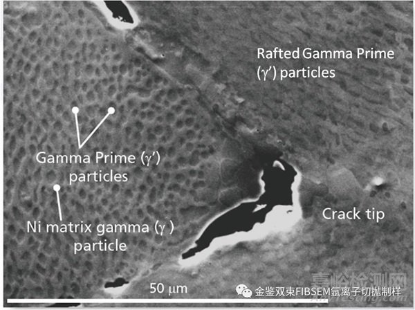 圖1為拋光樣品的二次電子圖像,微觀組織包括大晶粒γ相基體,以及其中包含的γ’析出相。觀察到兩條裂紋尖端,下方裂紋尖端上的晶粒內(nèi)的γ’相粒子已經(jīng)出現(xiàn)筏化。裂紋的尖端附近也有一些較大尺寸的粒子。